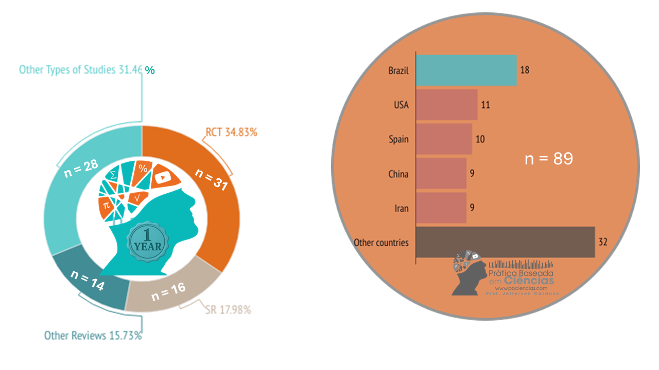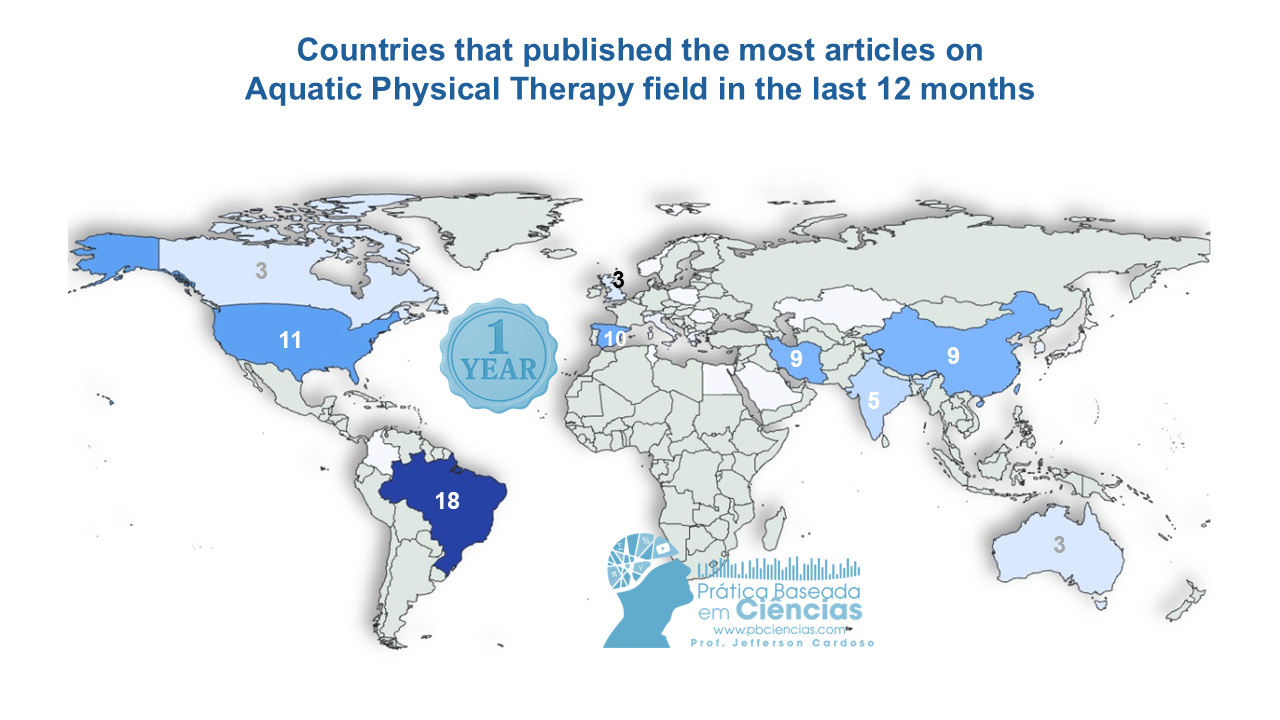 Olá, as informações sobre a quantidade de artigos, os países e os tipos de estudos em Fisioterapia Aquática estão abaixo. Os ensaios clínicos aleatórios (n = 31, 34,8 %) continuem sendo o tipo de estudo que mais foi publicado nos últimos 12 meses. As revisões sistemáticas (n =16, 18 %) aparecem na sequência. Outros tipos de revisões têm o n = 14 (15,7 %). Os três tipos de estudos representam 64 % das publicações. O Brasil continua sendo o país com o maior número de publicações (n = 18; 20 %), seguido dos Estados Unidos e Espanha. Os três países juntos representam quase 44 % das publicações no último ano. Um dado curioso, temos um artigo publicado em Fisioterapia Aquática a cada quatro dias. Essas figuras serão atualizadas trimestralmente.